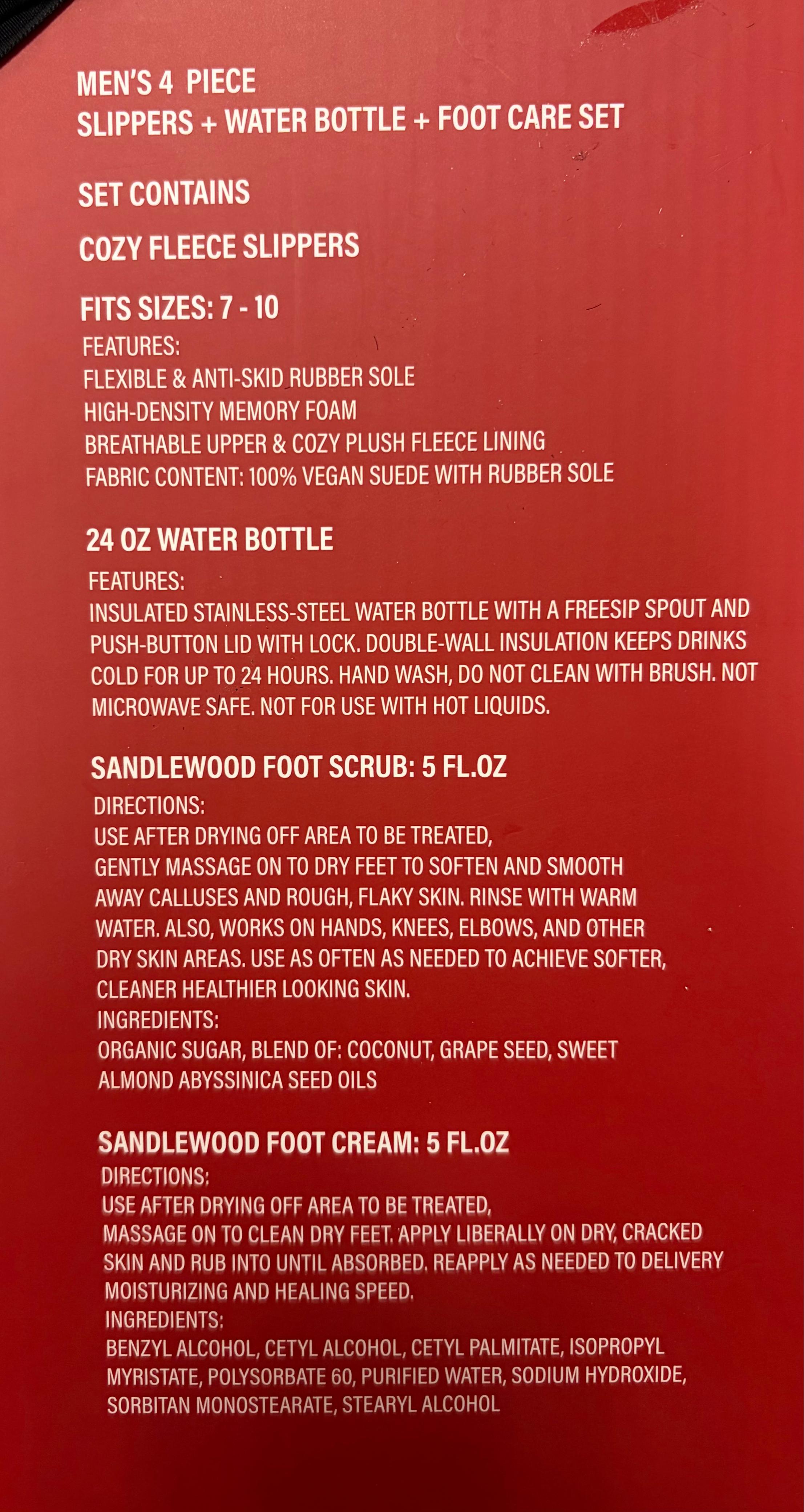 • Includes cozy slippers, reusable water bottle, foot cream, and foot scrub
