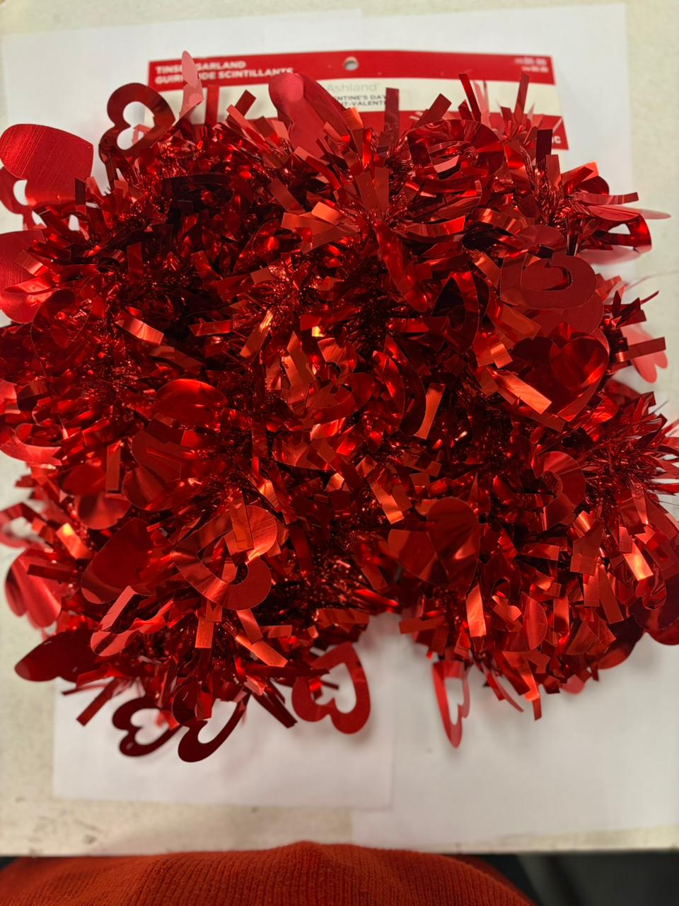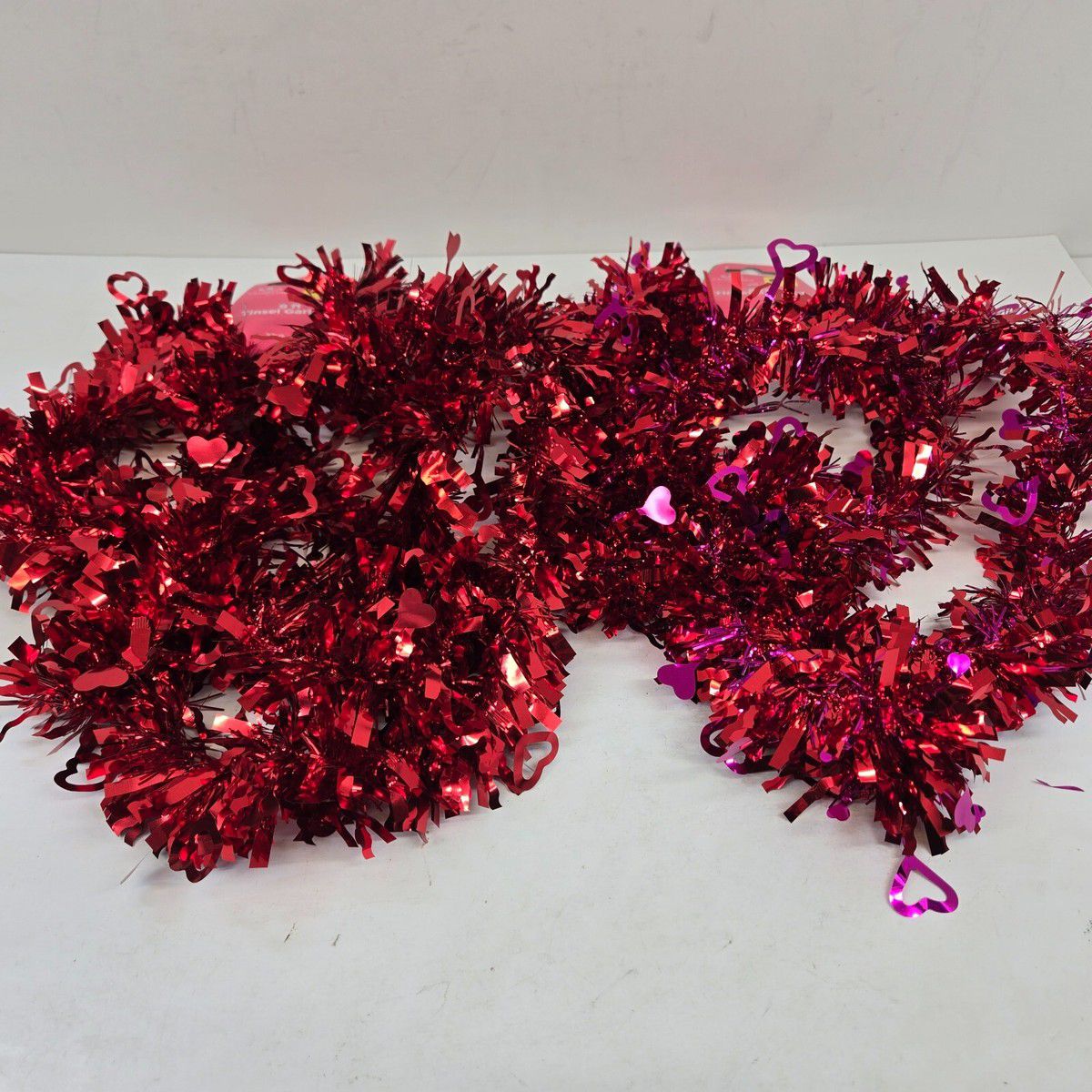 Shiny red tinsel garland with heart-shaped accents