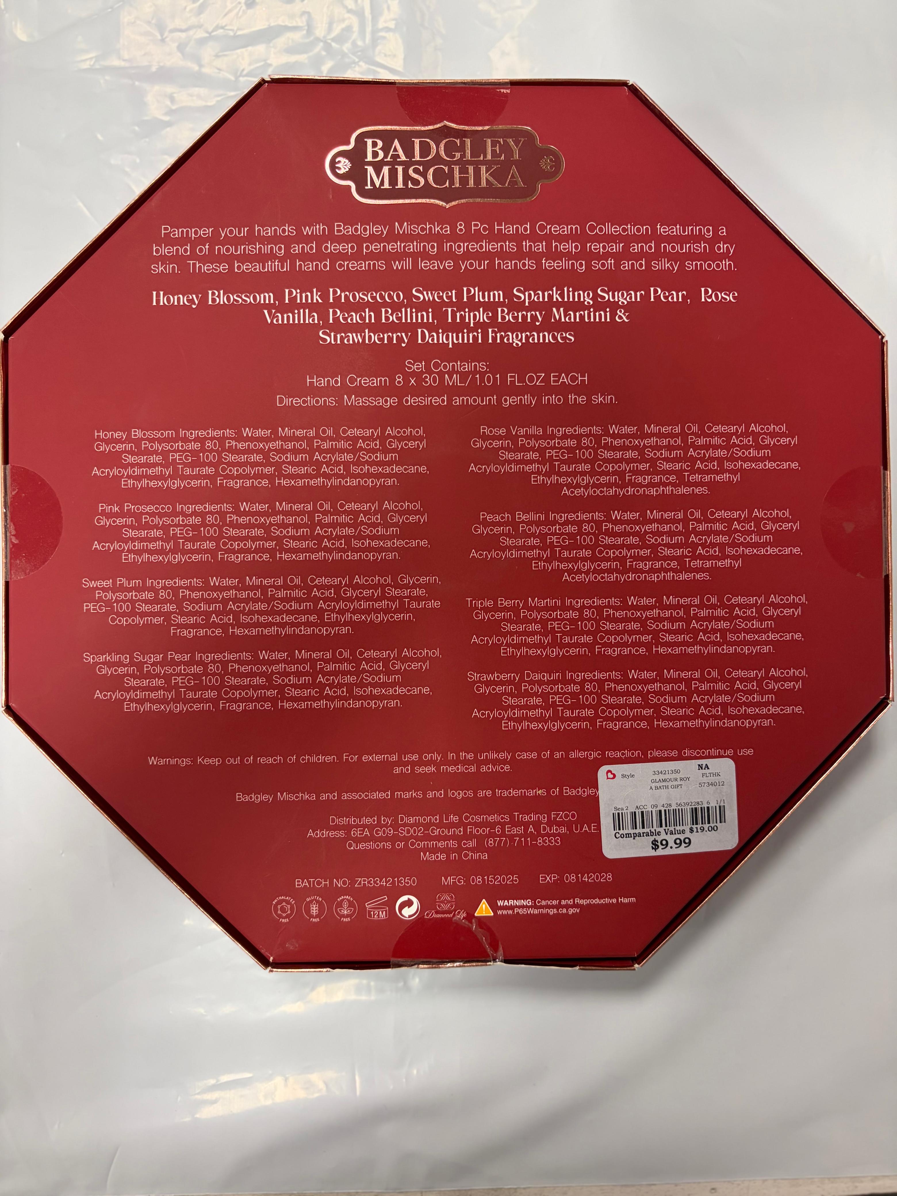 This Badgley Mischka hand cream set features an indulgent mix of fragrances including Honey Blossom, Pink Prosecco, Sweet Plum, Sparkling Sugar Pear, Rose Vanilla, Peach Bellini, Triple Berry Martini, and Strawberry Daiquiri. Each scent offers a unique blend that feels pampering without being overpowering.