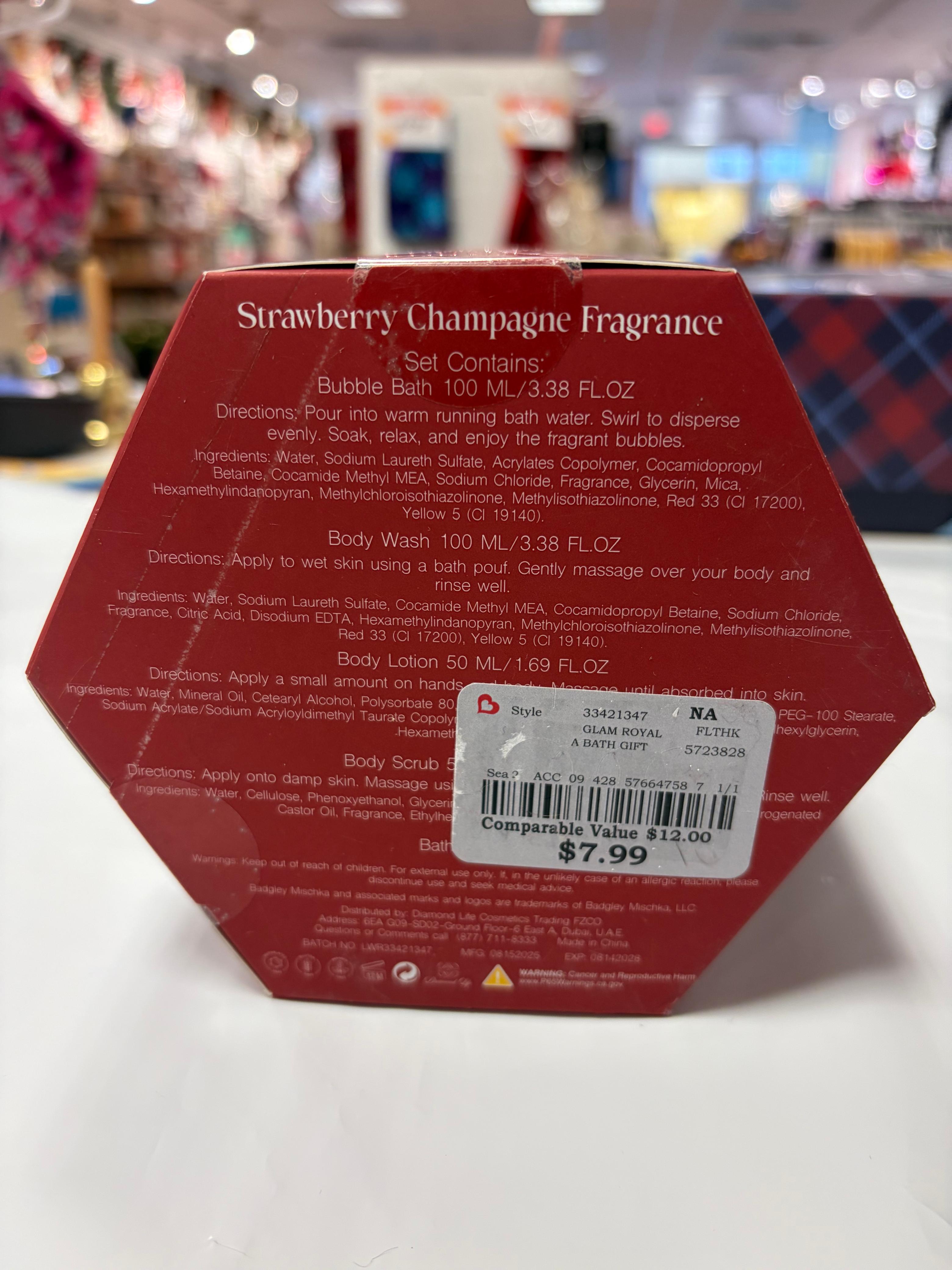 Badgley Mischka Strawberry Champagne 5-Piece Bath Essentials Gift Set turns everyday self-care into a bubbly, feel-good treat. Inspired by sweet strawberries and sparkling champagne, this luxe set makes pampering feel special without trying too hard.