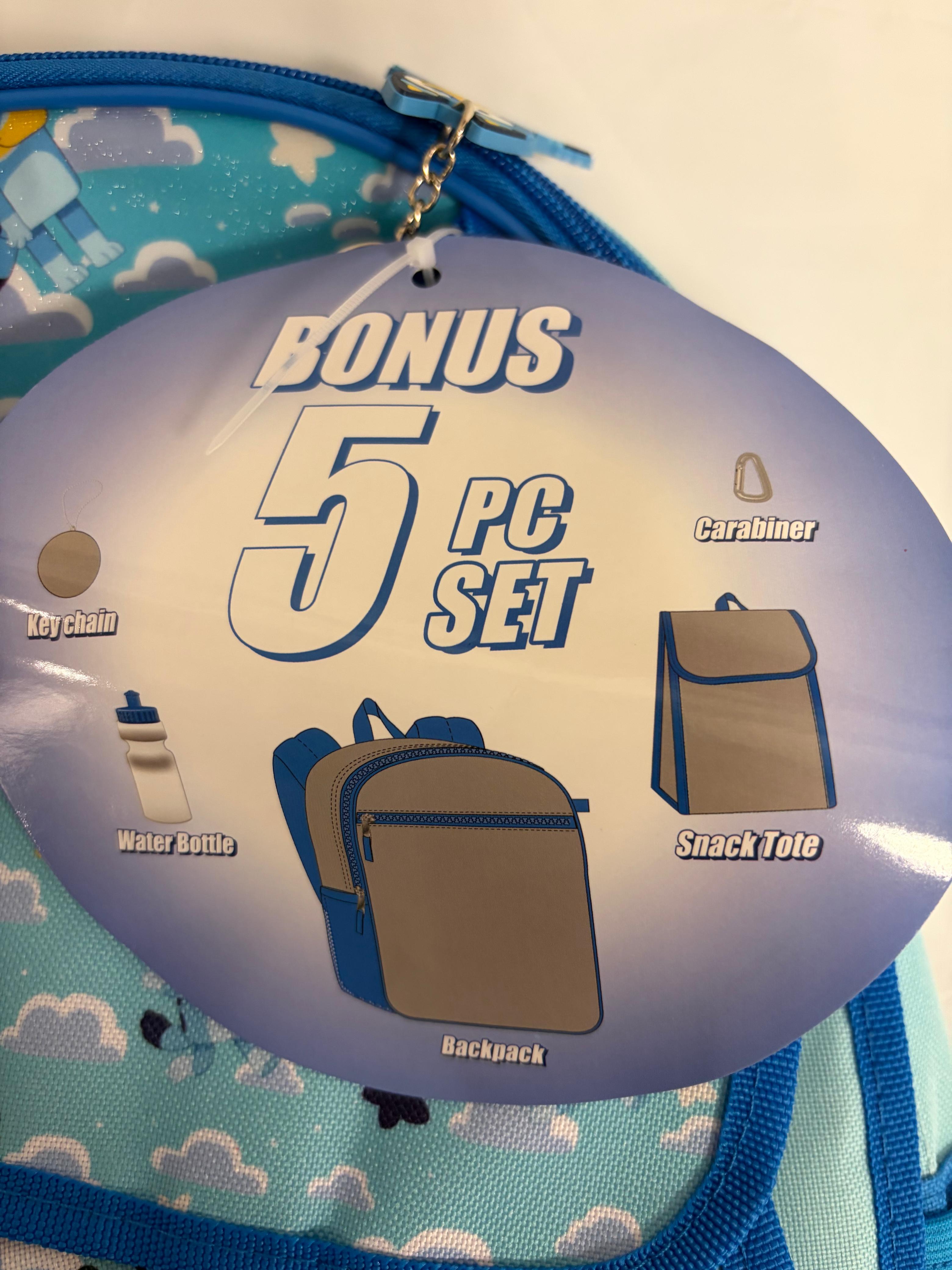 This 5-piece Bluey set is perfect for preschool, daycare, travel, or playdates. Everything matches, making it easy for kids to keep track of their belongings while staying excited to carry them.