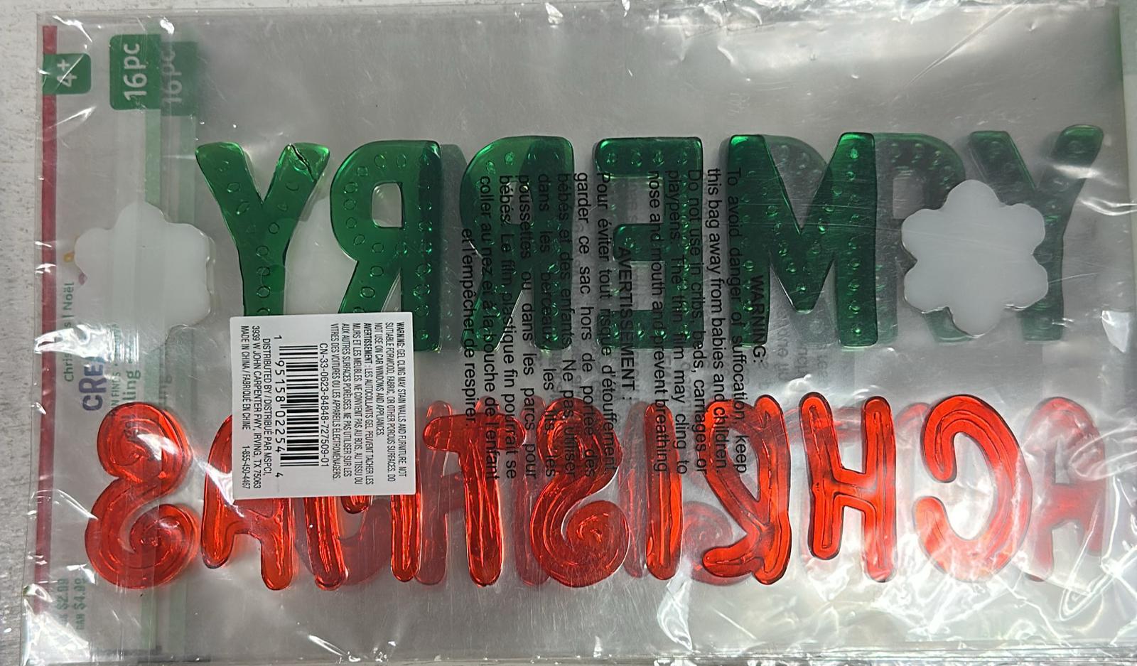 Includes 16 colorful gel clings in fun Christmas designs