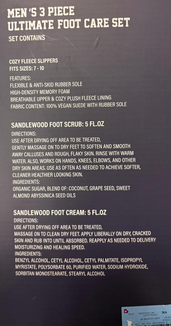 • Includes cozy fleece slippers, sandalwood foot scrub, and sandalwood foot cream