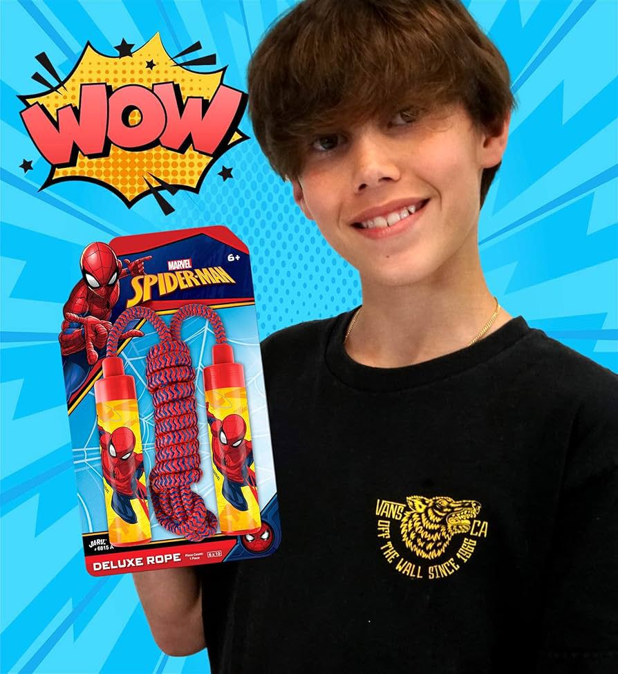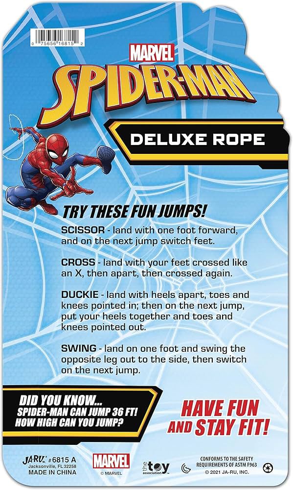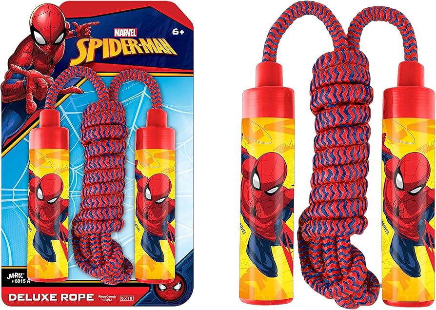 Spider-Man Deluxe Rope for Jump Rope Games brings superhero action to classic outdoor fun. With bold Spider-Man graphics, this jump rope makes exercise exciting while keeping kids active the old-fashioned way.