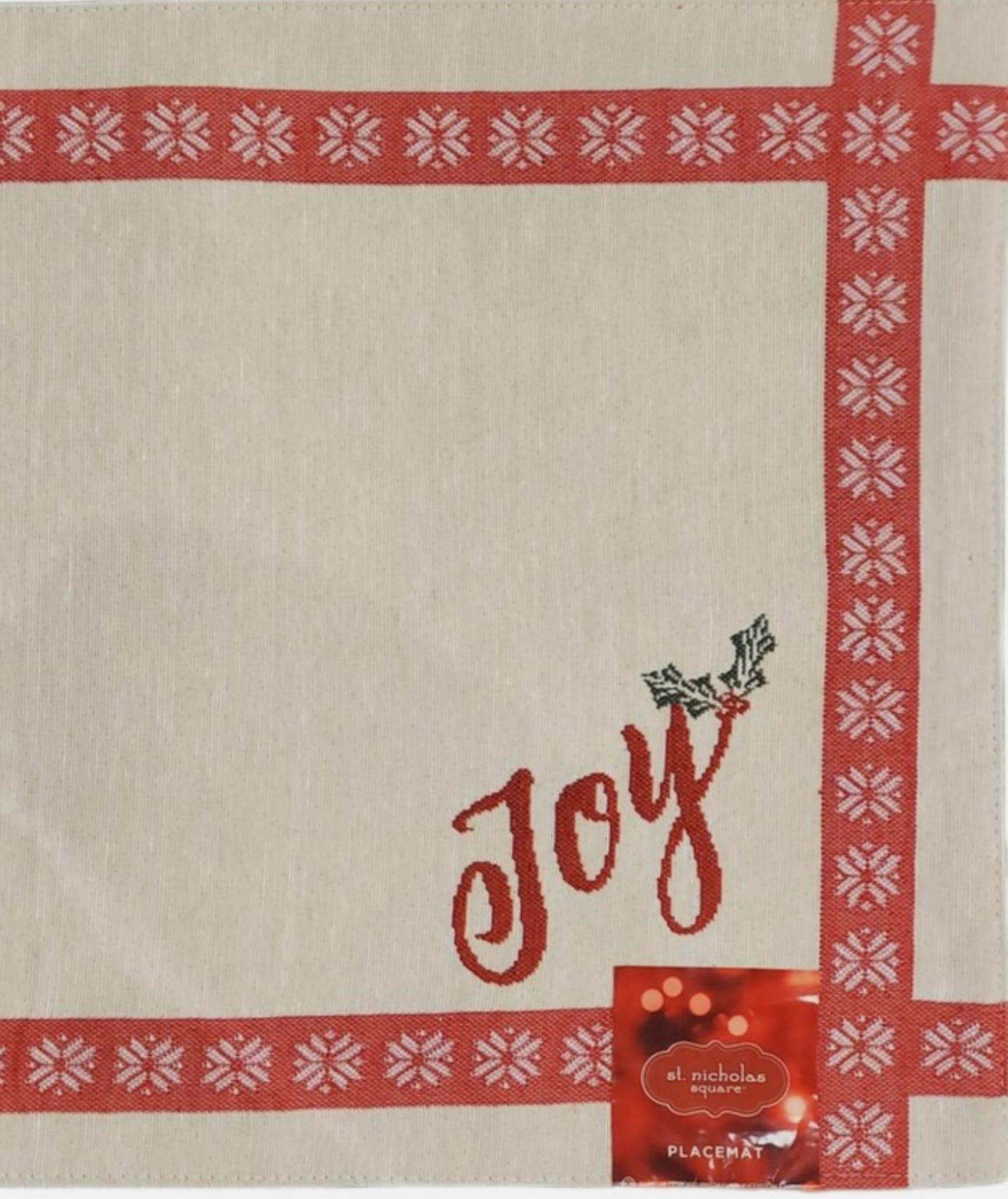 Set of placemats with embroidered “JOY” border and holiday accents