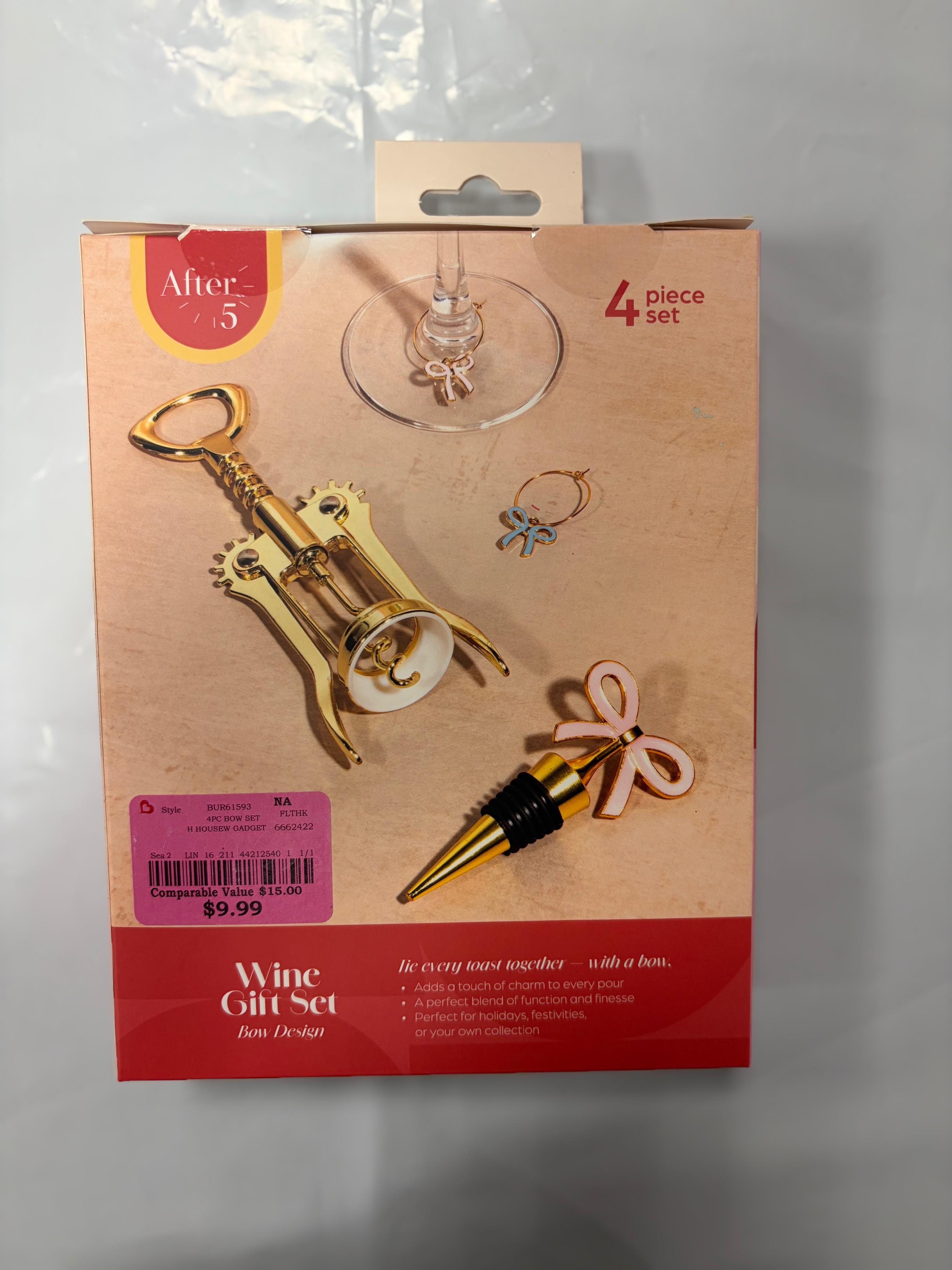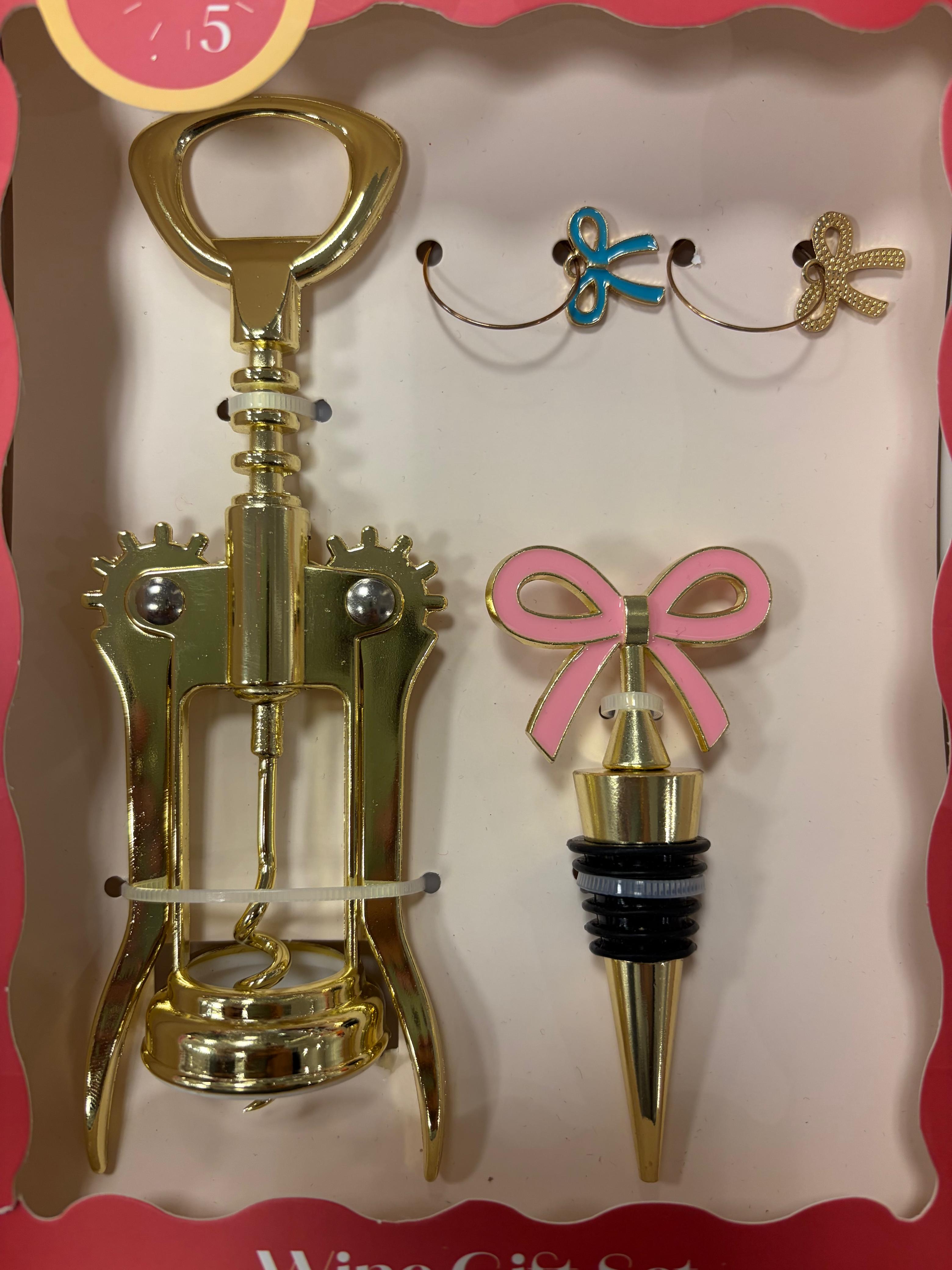 Wine Gift Set 4-Piece brings instant charm and elegance to any bottle you open. Wine Gift Set style meets function with pretty pink bows and gold finishes that feel extra special.